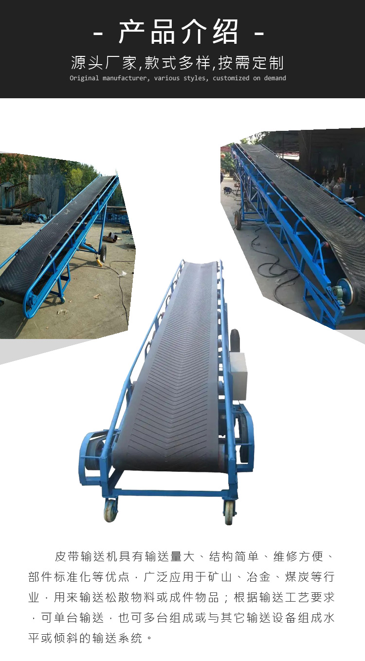 移動(dòng)式皮帶輸送機(jī)廣泛用于煤礦、糧食等行業(yè),其具有結(jié)構(gòu)簡(jiǎn)單、輸送量大、維修方便等特點(diǎn),根據(jù)生產(chǎn)需求可單臺(tái)或多臺(tái)使用,以滿足不同的作業(yè)需求。