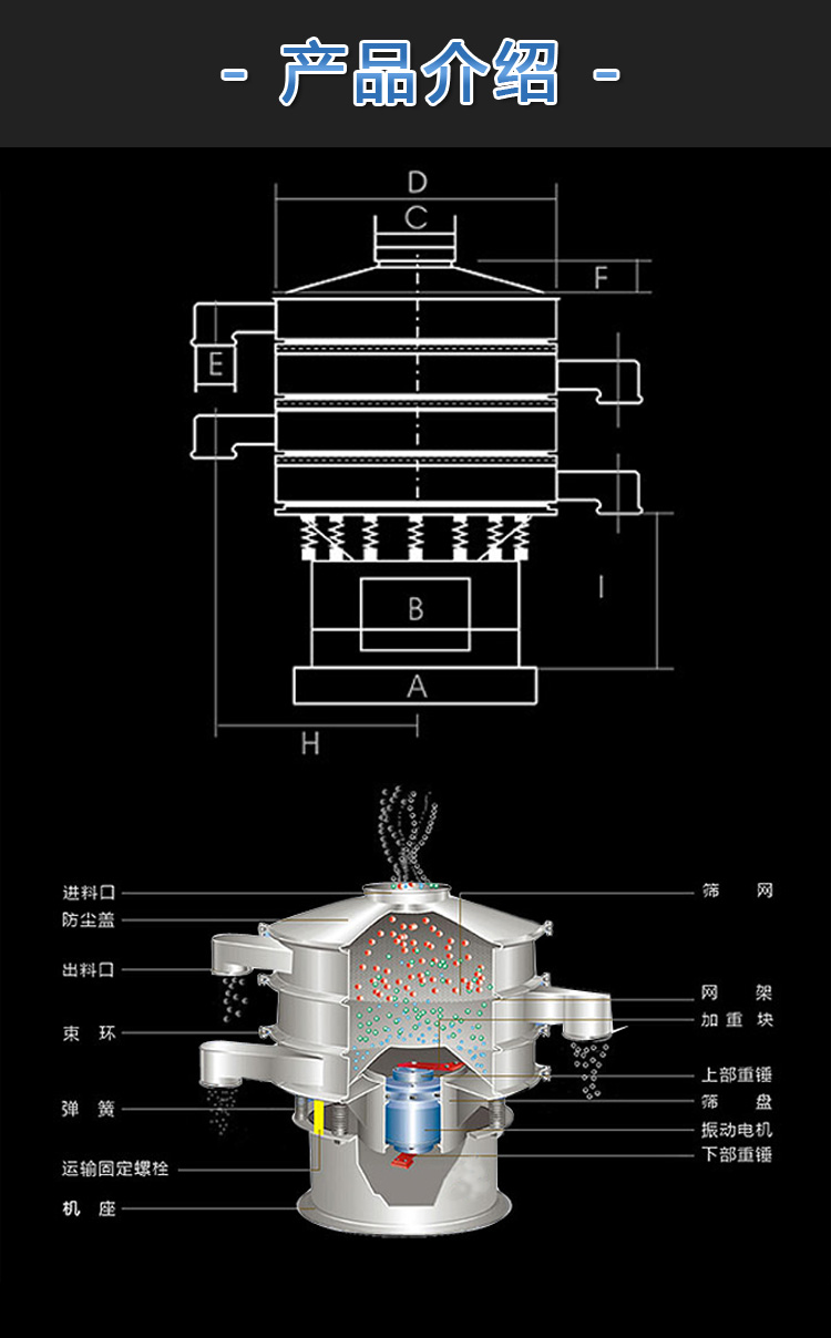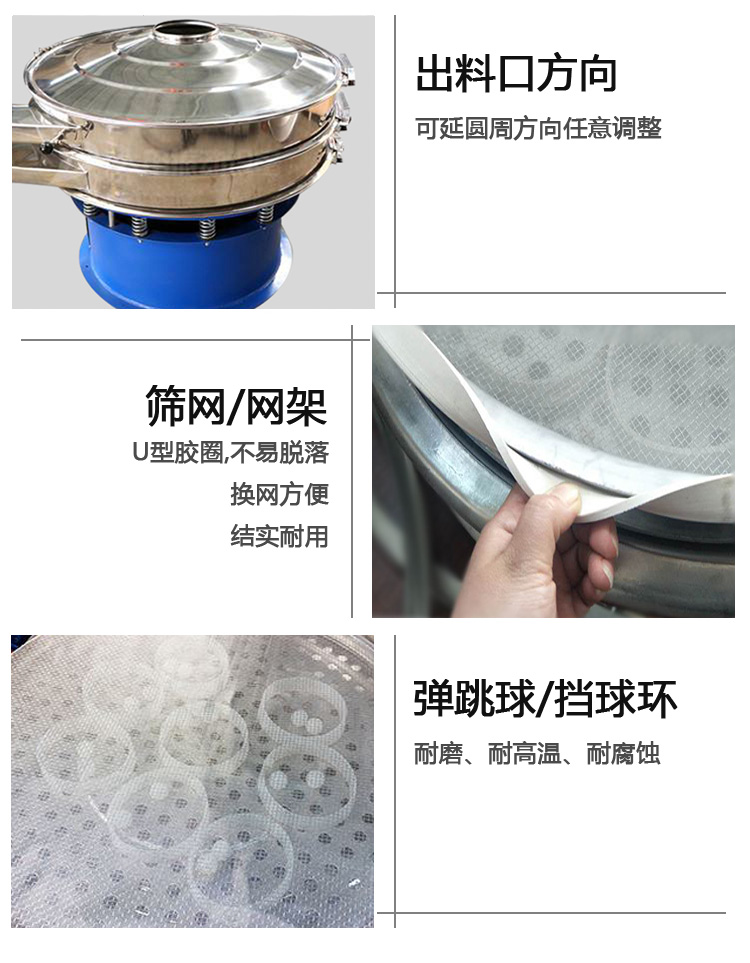 液體涂料振動篩啟動后,其動力裝置,即振動電機上端和下端具有不同相位的偏心塊,由于高速放置而產生復合慣性力。慣性力迫使篩機的振動體作復合旋轉運動,篩架在振動力的作用下作連續往復運動,驅動篩面周期性振動,使篩面上的物料與篩箱作定向跳躍式運動,在此期間,小于篩網表面孔徑的材料通過篩孔下降到下層,成為篩下物。大于篩面孔徑的物料在連續跳躍運動后從出料口排出,最終完成篩分工作。